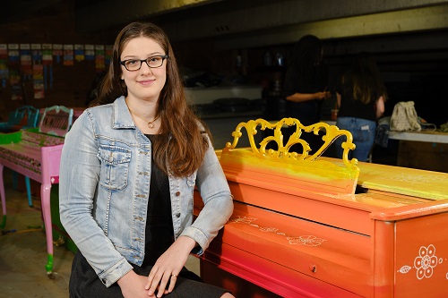 She is one of the artists of the ‘Pop-Up Piano’ project, the latest installment of the Rosemont Mural Initiative. Eight custom painted upright pianos have since moved from the garage to various public spaces throughout the Village of Rosemont. Gilmore and other students worked under the mentorship of internationally recognized, award winning artist Rahmaan Statik.