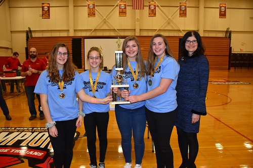 Triton College President Mary-Rita Moore (right) pictured with students who participated in an Action Challenge competition at Triton College sponsored by the National Fluid Power Association in December 2018.
