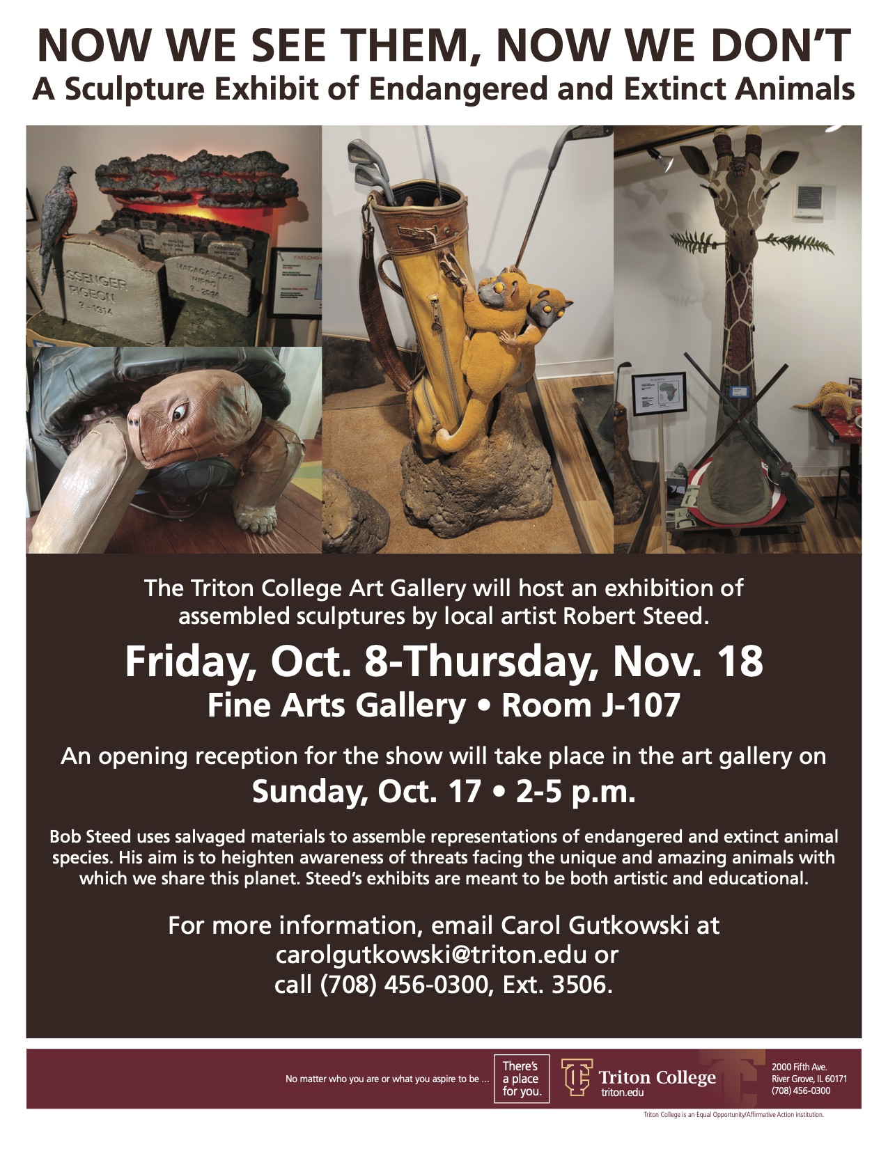 Robert Steed uses salvaged materials to assemble representations of endangered and extinct animal species. His aim is to heighten awareness of threats facing the unique and amazing animals with which we share this planet. Steed’s exhibits are meant to be both artistic and educational. For more information, email Carol Gutkowski at carolgutkowski@triton.edu or call (708) 456-0300, Ext. 3506.