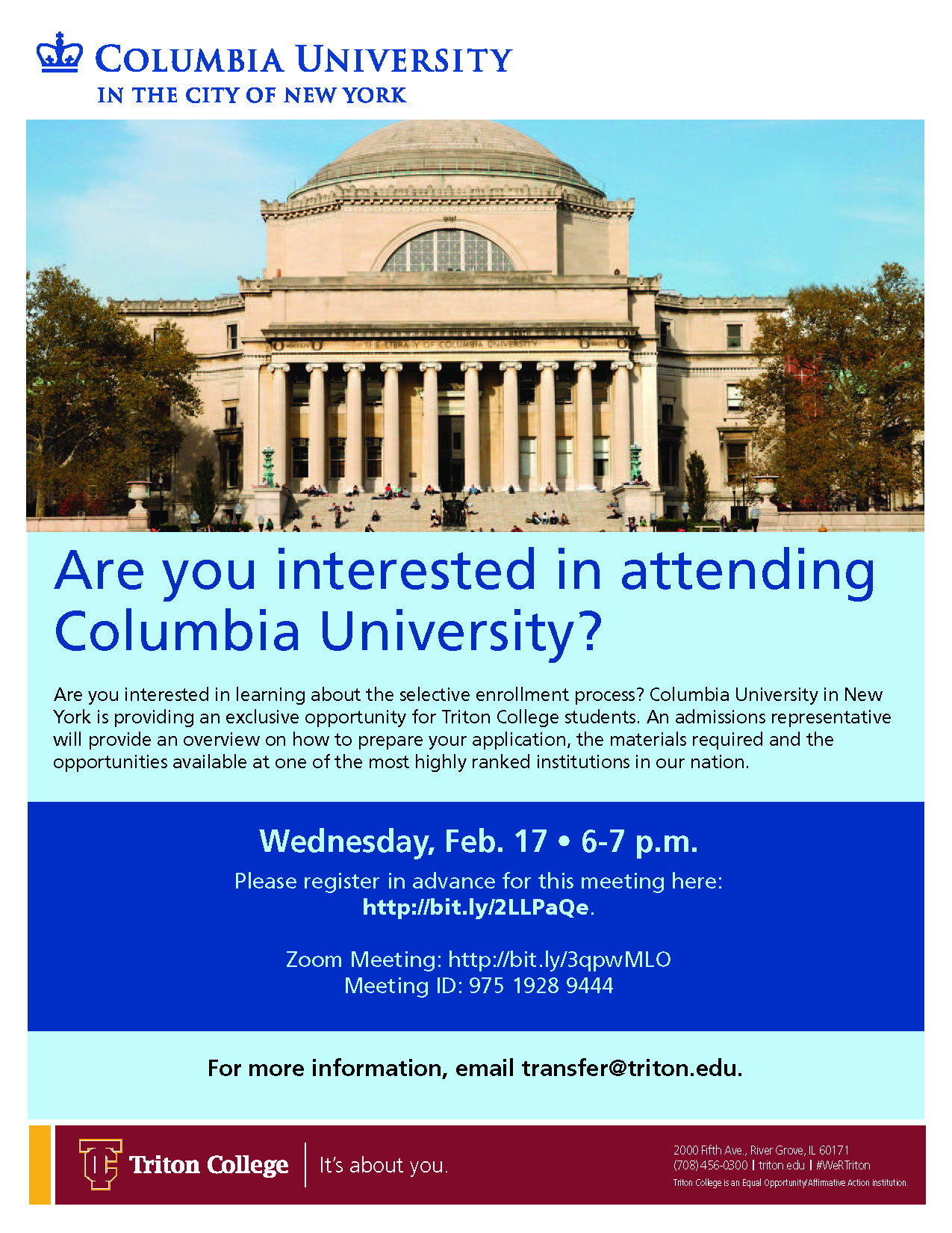 Are you interested in learning about the selective enrollment process? Columbia University in New York is providing an exclusive opportunity for Triton College students. An admissions representative will provide an overview on how to prepare your application, the materials required, and the opportunities available at one of the most highly ranked institutions in our nation.