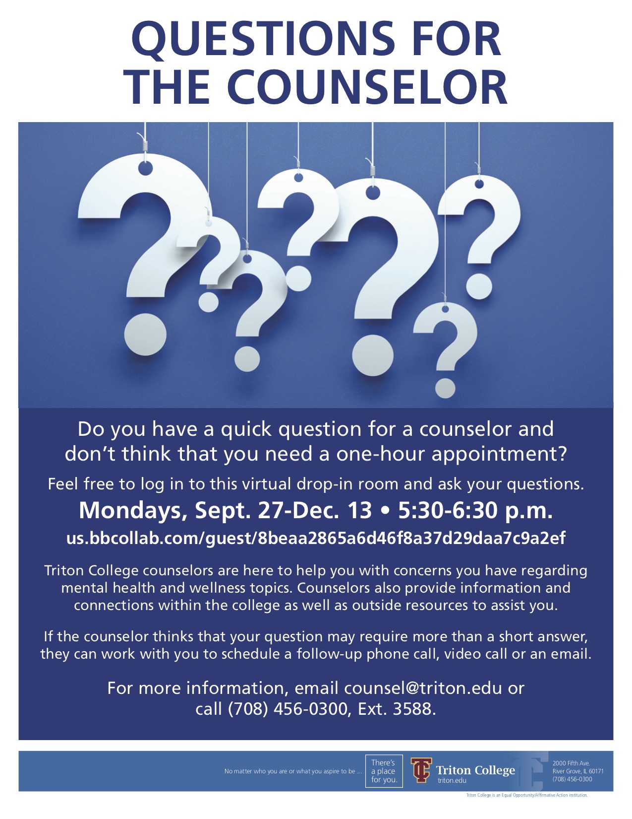 Triton College counselors are here to help with concerns you have regarding mental health and wellness topics.