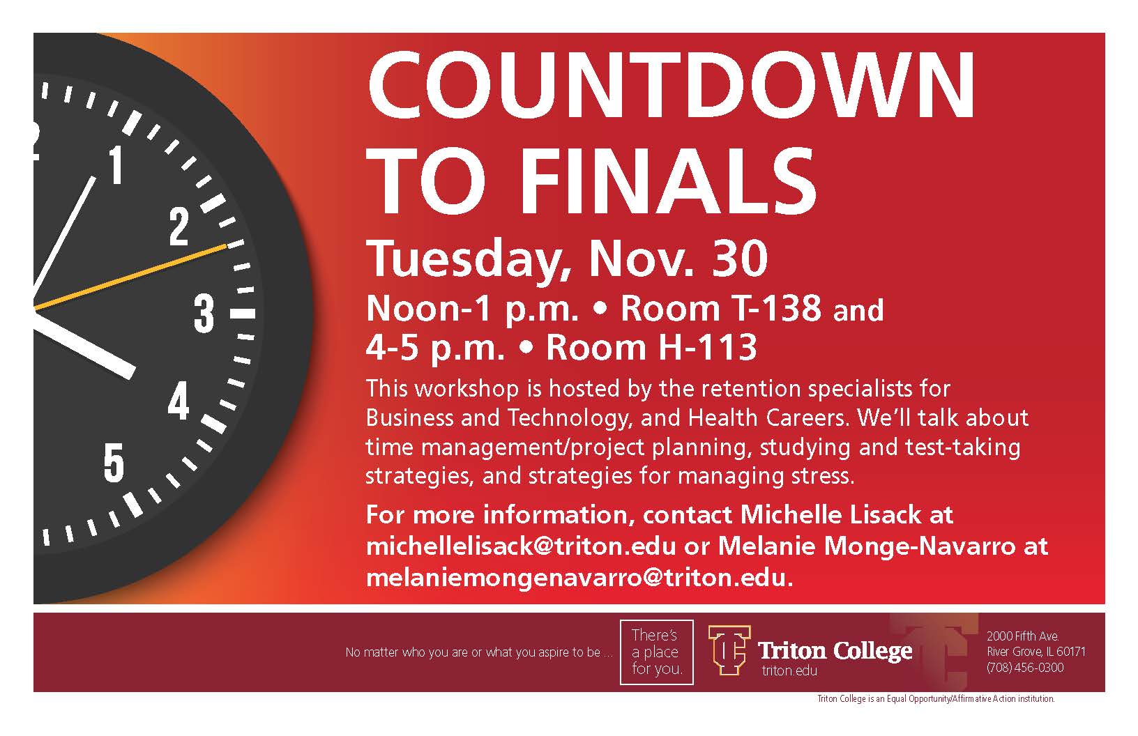 Retention specialists will host a pre-finals workshop for Business and Technology, and Health Careers students. Time management, project planning, studying and test-taking strategies will be discussed. Strategies for managing stress will also be covered.