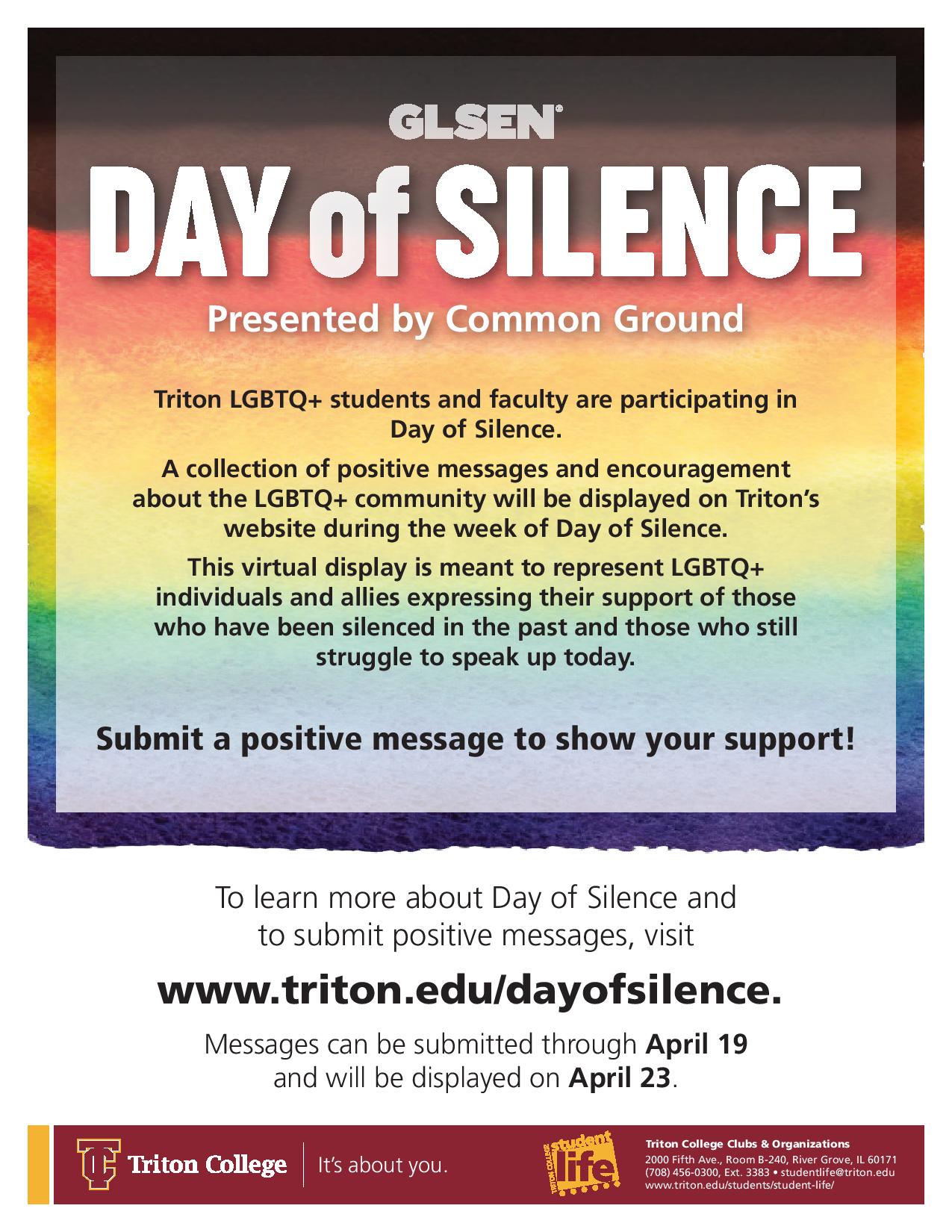 The Day of Silence is a nationally recognized event organized by the Gay, Lesbian & Straight Education Network (GLSEN) meant to represent LGBTQ+ people who have been silenced in the past and present. It was founded by college students in the 1990s and has since spread nationwide. During the month of April, students go an entire day without speaking during school and at the end of the day they break their silence to discuss ways their institutions can be more inclusive.