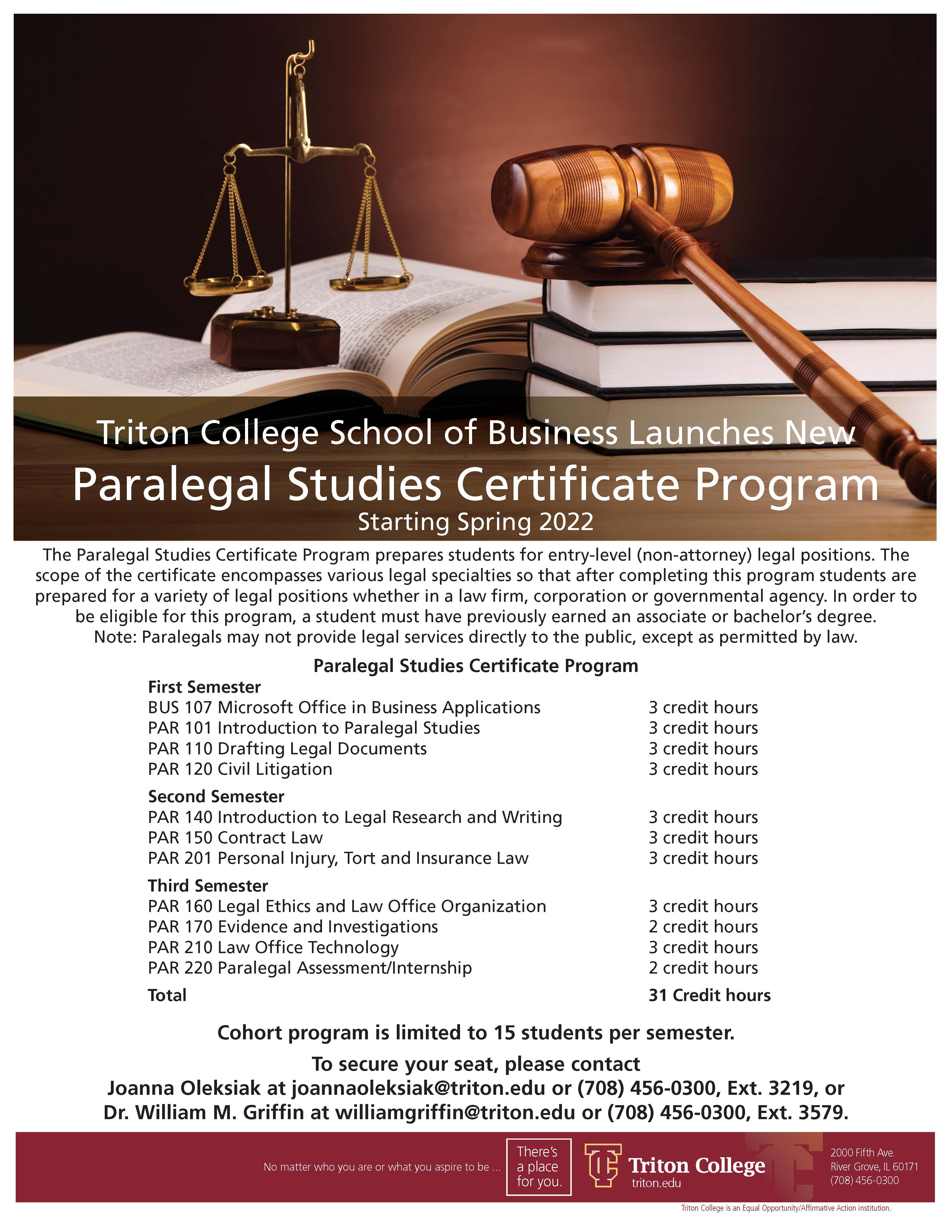 To secure a seat in the program contact Joanna Oleksiak at joannaoleksiak@triton.edu or (708) 456-0300, Ext. 3219, or Dr. William M. Griffin at williamgriffin@triton.edu or (708) 456-0300, Ext. 3579.