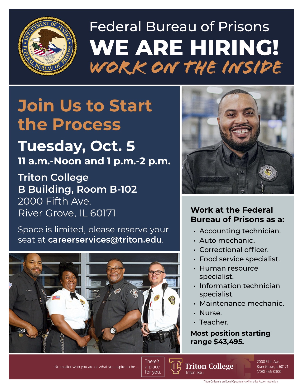 Triton College will host a U.S. Department of Justice (DOJ) Hiring Event. The event is free, but attendees should email careerservices@triton.edu and reserve a spot to speak with recruiters from the DOJ Federal Bureau of Prisons. All attendees should dress professionally and bring resumes. Most salaries start at $43,495.