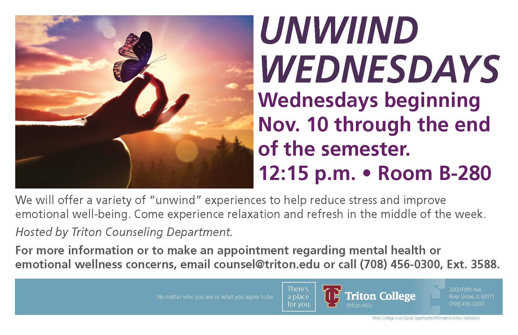 The Counseling Department will offer a variety of "unwind" experiences to help reduce stress and improve emotional well-being. All students are welcomed to experience relaxation and refresh in the middle of the week.