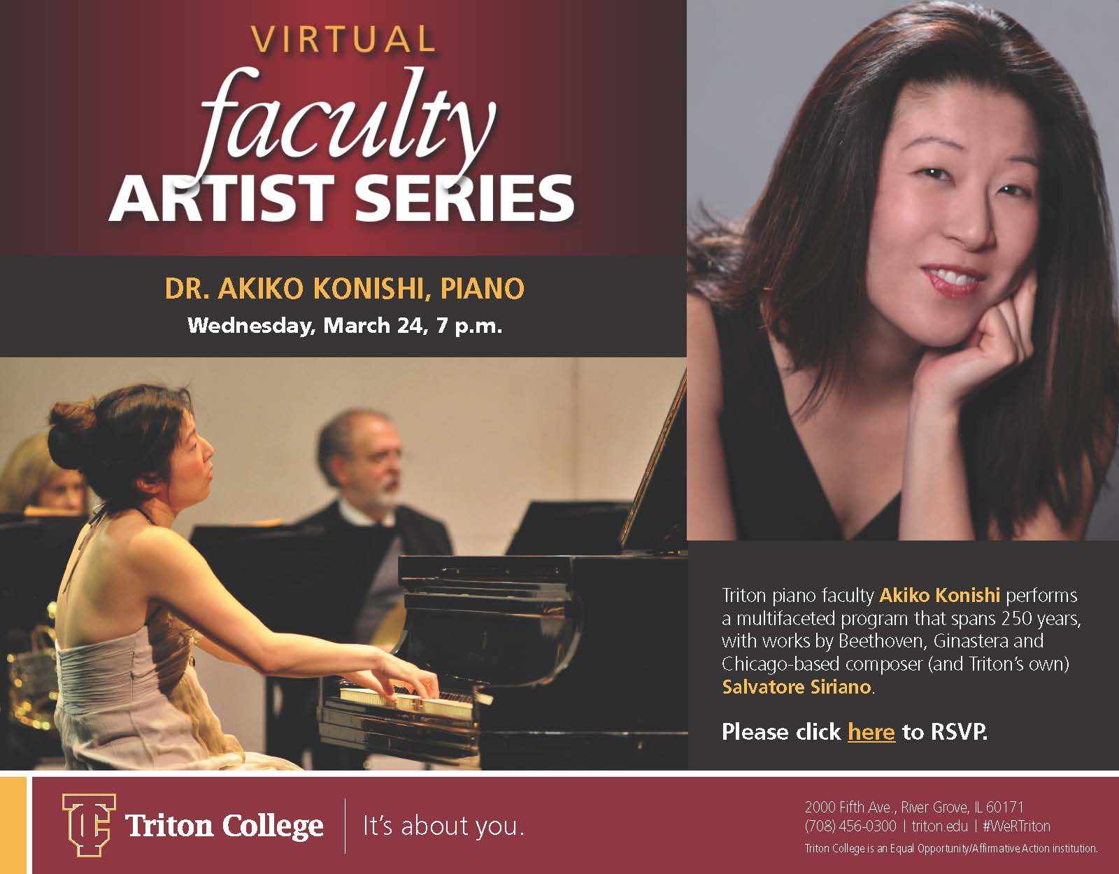 Triton piano faculty Akiko Konishi performs a multifaceted program that spans 250 years, with works by Beethoven, Ginastera and Chicago-based composer (and Triton’s own) Salvatore Siriano.