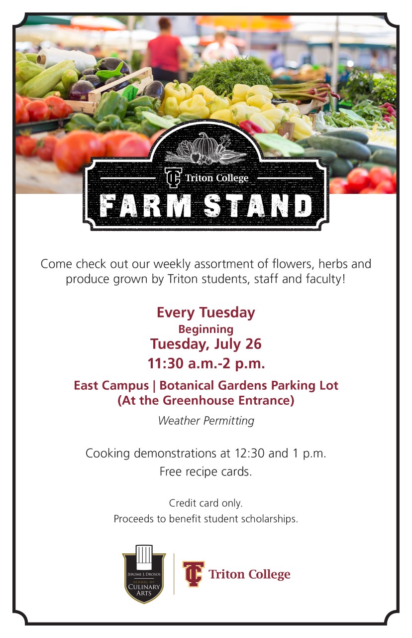 The Triton College Horticulture Department is hosting its Farm Stand every Tuesday, 11:30 a.m.-2 p.m., in the Botanical Gardens parking lot, weather permitting. Similar to a farmers’ market, flowers, herbs and produce grown by Triton College students, staff and faculty will be available for purchase. Other activities include cooking demonstrations at 12:30 and 1 p.m., along with free recipe cards given to those in attendance. Proceeds benefit student scholarships. Cash, checks and credit cards will be accepted.